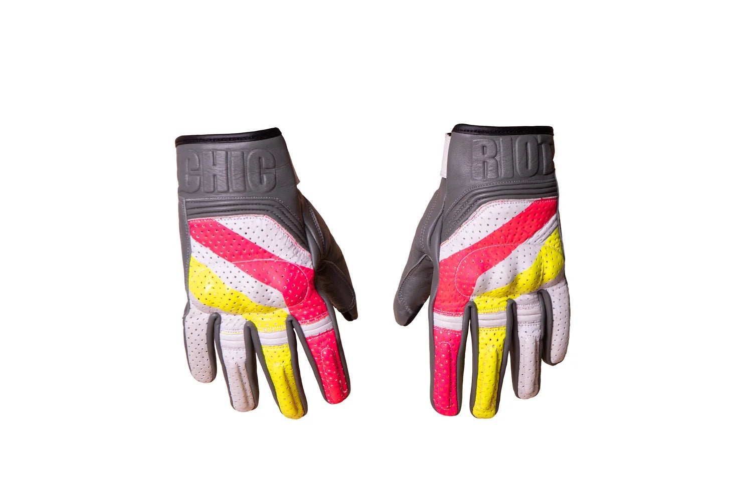 Add some color and style to your ride with the Lola moto gloves. Hot pink, neon yellow, white and gray perforated leather gloves with all the right style and protection.