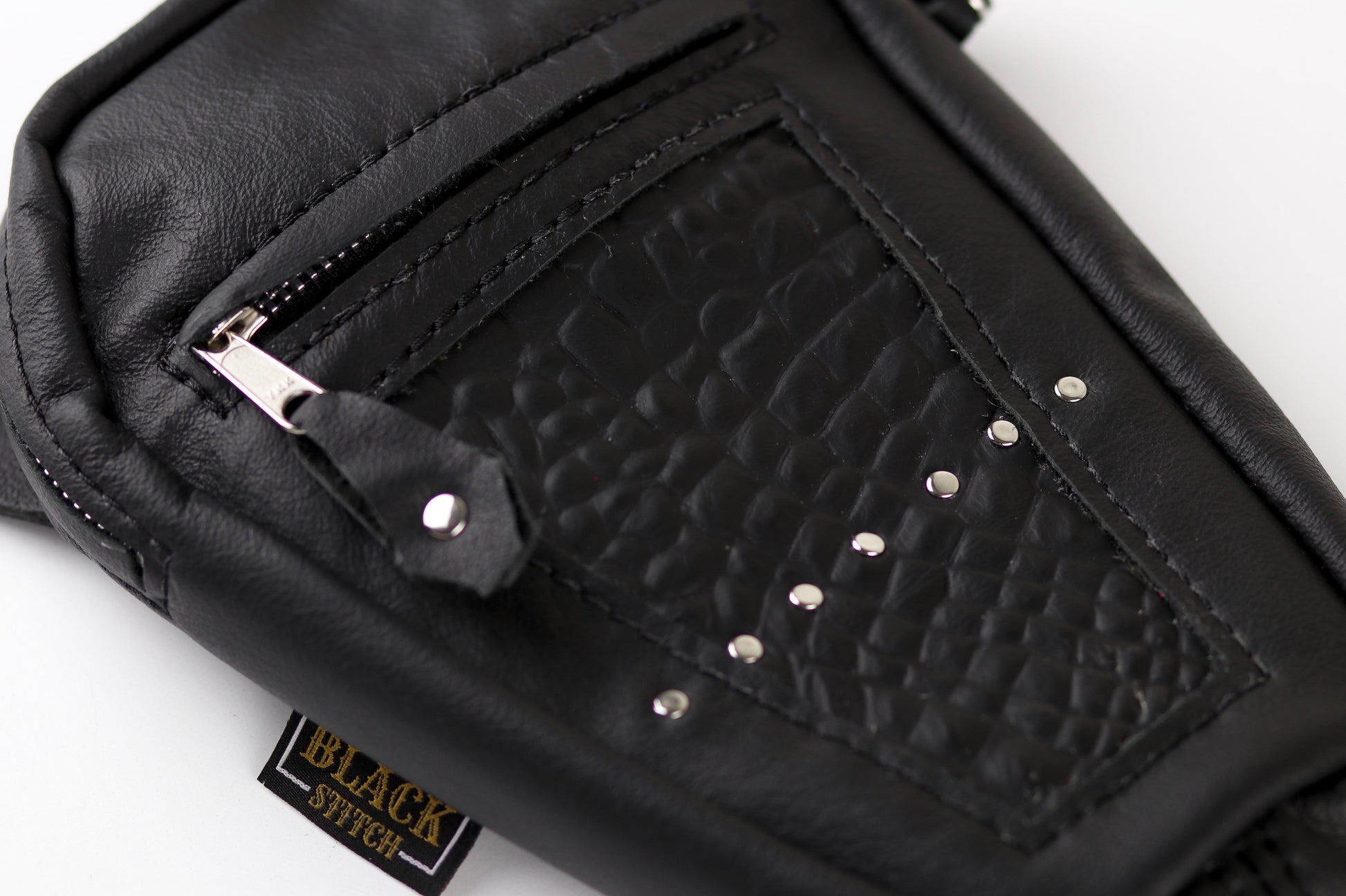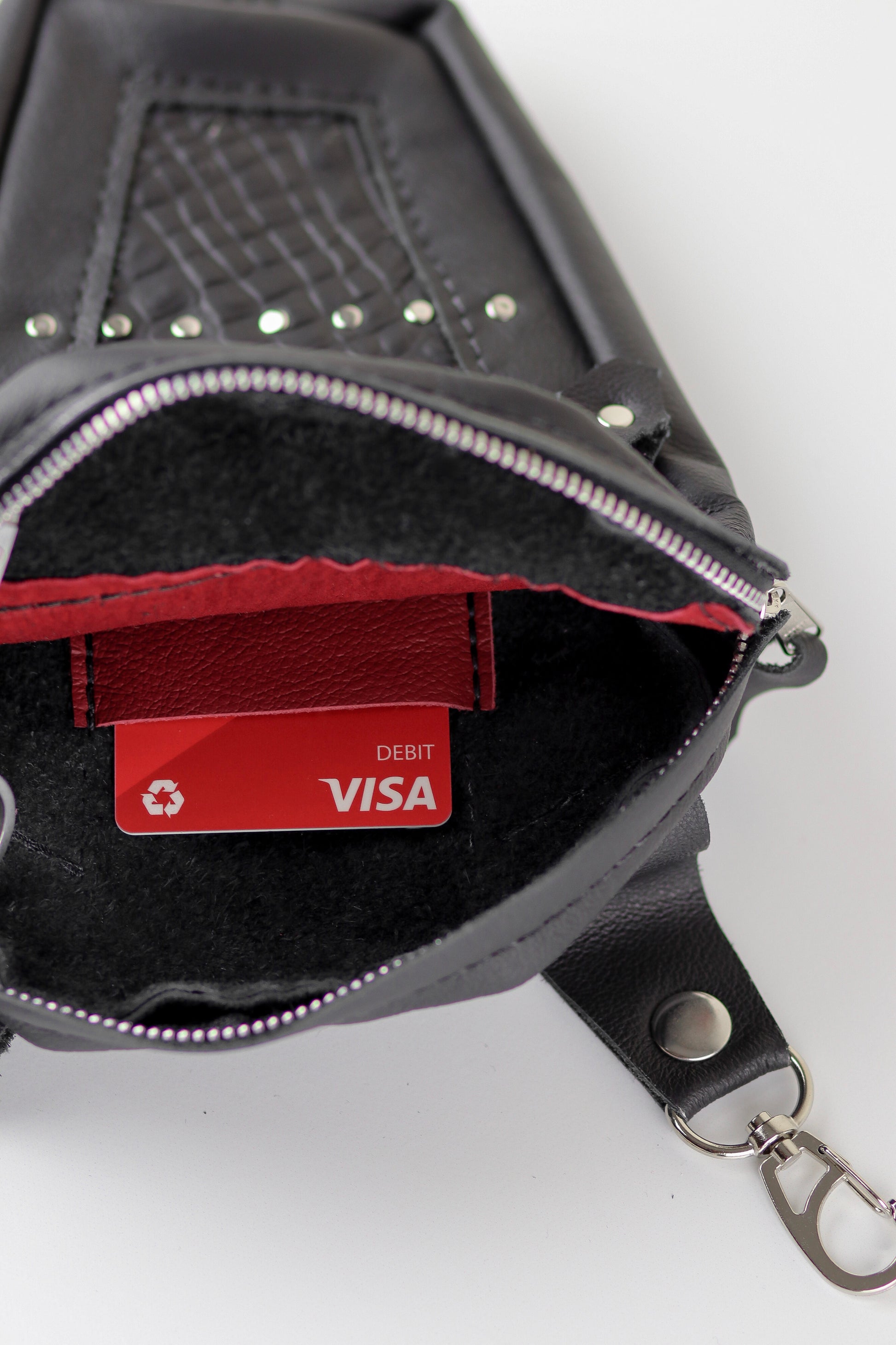 Fashioned from genuine leather remnants of hot rods, it's a testament to sustainability, boasting an embossed texture print leather inlay that adds both character and depth. Two convenient zipper pockets provide ample space, while a dedicated card holder slot in the main pocket keeps your essentials organized. Handset rivets underscore its durability and character.