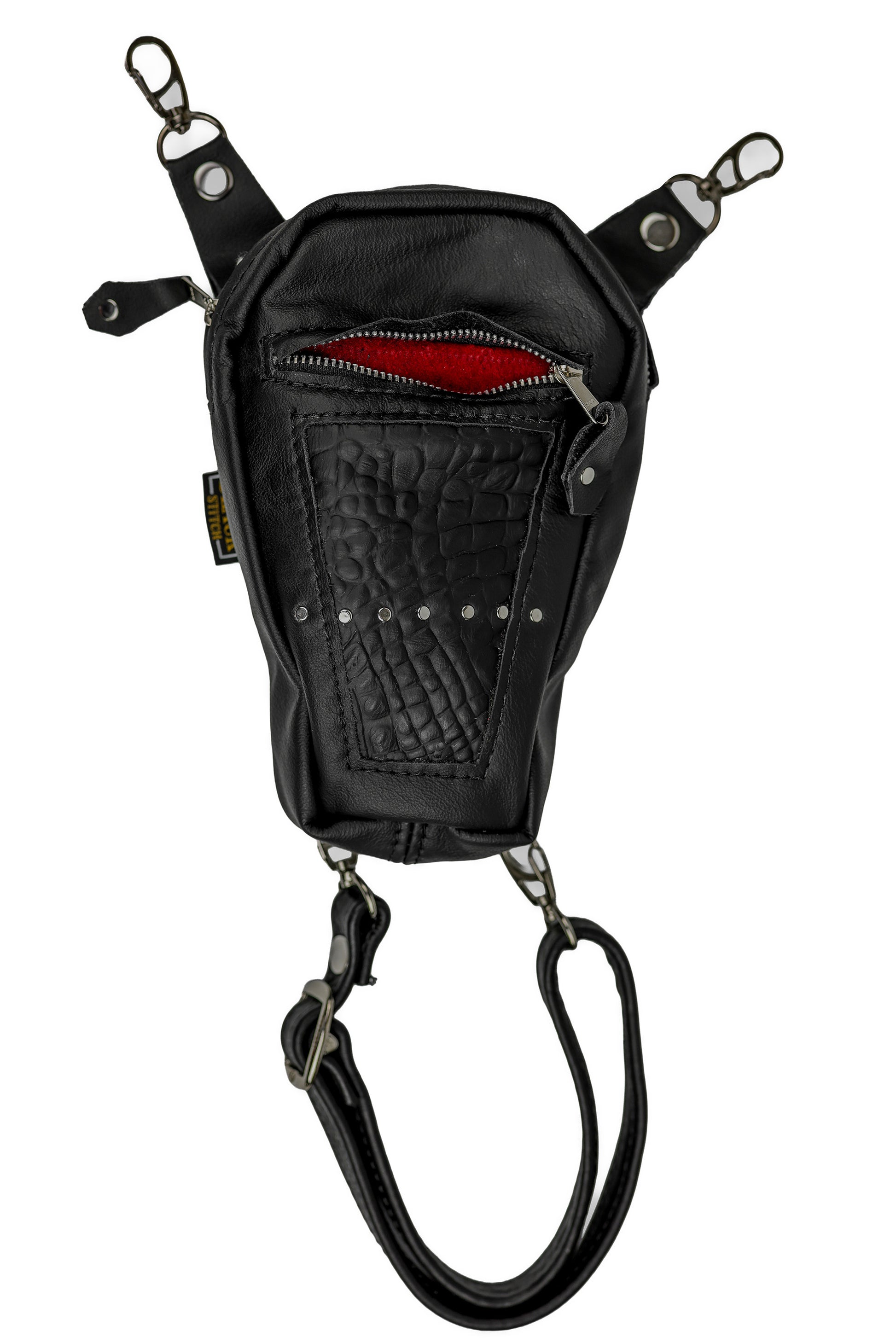 The perfect blend of unique and versatile, the Coffin leather thigh bag is just the right size to hold everything you need when you're ripping around on your motorcycle. And with its coffin shape, it fits the thigh and stays put during any trip.