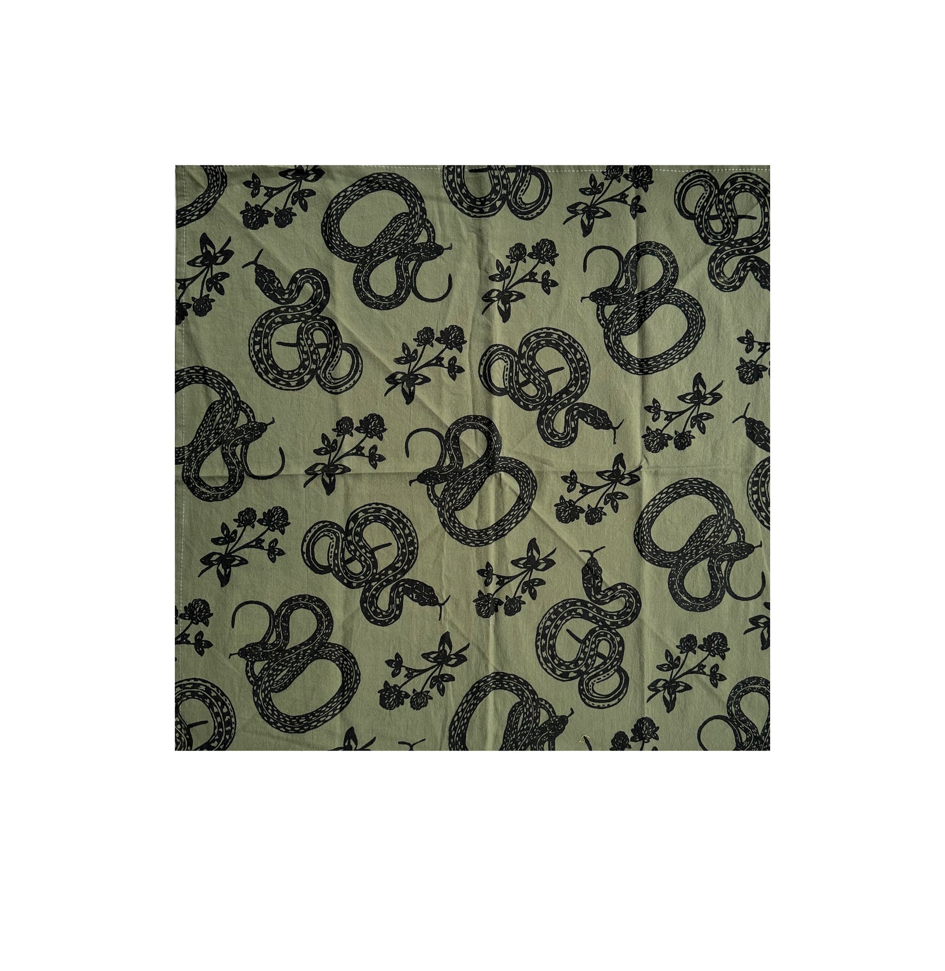 The Cutesy Snake Bandana has four hemmed edges and is block printed.